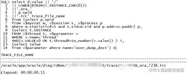 步骤 4:select d.value || '/'|| LOWER(RTRIM(i.INSTANCE,CHR(0)))||'_ora_'|| p.spid||'.trc' trace_file_namefrom (select p.spidfrom v$mystat m, v$session s, v$process pwhere m.statistic#=1 and s.sid=m.sid and p.addr=s.paddr) p,(select t.INSTANCEFROM v$thread t, v$parameter vWHERE v.name='thread'AND(v.VALUE=0 OR t.thread#=to_number(v.value)) ) i,(select value from v$parameter where name='user_dump_dest') d;tkprof /oracle/app/oracle/diag/rdbms/PROD/PRODSTB/trace/PROD_ora_7238.trc /tmp/10046_sql.log sys=no sort=prsela,exeela,fchelacat /tmp/10046_sql.log********************************************************************************OVERALL TOTALS FOR ALL NON-RECURSIVE STATEMENTScall count cpu elapsed disk query current rows------- ------ -------- ---------- ---------- ---------- ---------- ----------Parse 2 0.00 0.00 0 0 0 0Execute 2 0.00 0.00 0 0 0 0Fetch 2 1.08 1.78 9568 10117 0 1------- ------ -------- ---------- ---------- ---------- ---------- ----------total 6 1.09 1.79 9568 10117 0 1Misses in library cache during parse: 1Elapsed times include waiting on following events:Event waited on Times Max. Wait Total Waited---------------------------------------- Waited ---------- ------------SQL*Net message to client 3 0.00 0.00SQL*Net message from client 3 31.01 55.20db file sequential read 130 0.01 0.13db file scattered read 274 0.03 1.07OVERALL TOTALS FOR ALL RECURSIVE STATEMENTScall count cpu elapsed disk query current rows------- ------ -------- ---------- ---------- ---------- ---------- ----------Parse 0 0.00 0.00 0 0 0 0Execute 0 0.00 0.00 0 0 0 0Fetch 0 0.00 0.00 0 0 0 0------- ------ -------- ---------- ---------- ---------- ---------- ----------total 0 0.00 0.00 0 0 0 0Misses in library cache during parse: 02 user SQL statements in session.0 internal SQL statements in session.2 SQL statements in session.********************************************************************************
