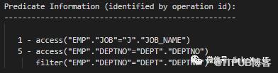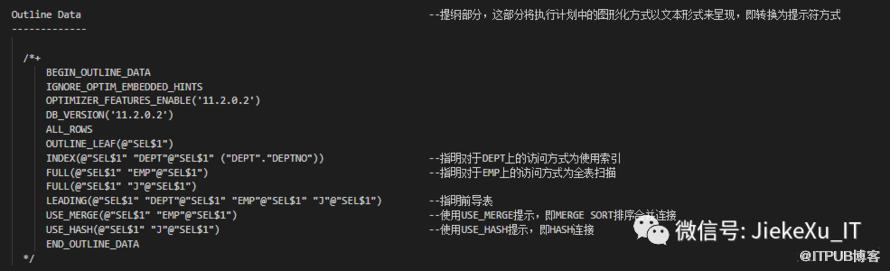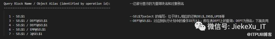 Query Block Name / Object Alias (identified by operation id): --这部分显示的为查询块名和对象别名------------------------------------------------------------- 1 - SEL$1 --SEL$为select 的缩写,位于块1,相应的还有DEL$,INS$,UPD$等 3 - SEL$1 / DEPT@SEL$1 --DEPT@SEL$1,对应到执行计划中的操作ID为3上,即在表DEPT上的查询,DEPT为别名,下面类同 4 - SEL$1 / DEPT@SEL$1 6 - SEL$1 / EMP@SEL$1 7 - SEL$1 / J@SEL$1