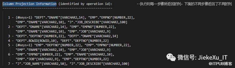 Column Projection Information (identified by operation id): --执行时每一步骤所返回的列,下面的不同步骤返回了不同的列----------------------------------------------------------- 1 - (#keys=1) "DEPT"."DNAME"[VARCHAR2,14], "EMP"."EMPNO"[NUMBER,22], "EMP"."ENAME"[VARCHAR2,10], "J"."JOB_DESCRIBE"[VARCHAR2,100] 2 - "DEPT"."DNAME"[VARCHAR2,14], "EMP"."EMPNO"[NUMBER,22], "EMP"."ENAME"[VARCHAR2,10], "EMP"."JOB"[VARCHAR2,9] 3 - "DEPT"."DEPTNO"[NUMBER,22], "DEPT"."DNAME"[VARCHAR2,14] 4 - "DEPT".ROWID[ROWID,10], "DEPT"."DEPTNO"[NUMBER,22] 5 - (#keys=1) "EMP"."DEPTNO"[NUMBER,22], "EMP"."EMPNO"[NUMBER,22], "EMP"."ENAME"[VARCHAR2,10], "EMP"."JOB"[VARCHAR2,9] 6 - "EMP"."EMPNO"[NUMBER,22], "EMP"."ENAME"[VARCHAR2,10], "EMP"."JOB"[VARCHAR2,9], "EMP"."DEPTNO"[NUMBER,22] 7 - "J"."JOB_NAME"[VARCHAR2,50], "J"."JOB_DESCRIBE"[VARCHAR2,100]