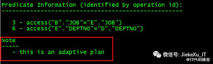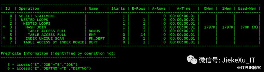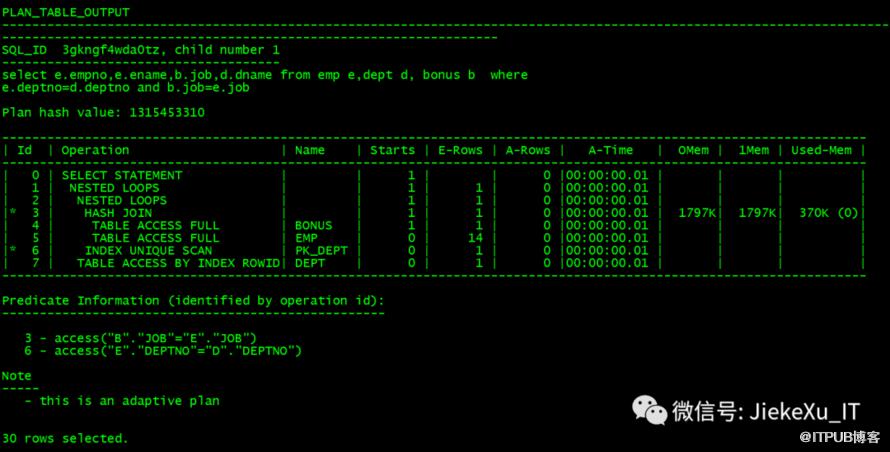 set autot onselect e.empno,e.ename,b.job,d.dname from emp e,dept d, bonus b where e.deptno=d.deptno and b.job=e.job;Execution Plan----------------------------------------------------------Plan hash value: 1315453310----------------------------------------------------------------------------------------| Id | Operation | Name | Rows | Bytes | Cost (%CPU)| Time |----------------------------------------------------------------------------------------| 0 | SELECT STATEMENT | | 1 | 40 | 6 (0)| 00:00:01 || 1 | NESTED LOOPS | | 1 | 40 | 6 (0)| 00:00:01 || 2 | NESTED LOOPS | | 1 | 40 | 6 (0)| 00:00:01 ||* 3 | HASH JOIN | | 1 | 27 | 5 (0)| 00:00:01 || 4 | TABLE ACCESS FULL | BONUS | 1 | 6 | 2 (0)| 00:00:01 || 5 | TABLE ACCESS FULL | EMP | 14 | 294 | 3 (0)| 00:00:01 ||* 6 | INDEX UNIQUE SCAN | PK_DEPT | 1 | | 0 (0)| 00:00:01 || 7 | TABLE ACCESS BY INDEX ROWID| DEPT | 1 | 13 | 1 (0)| 00:00:01 |----------------------------------------------------------------------------------------Predicate Information (identified by operation id):---------------------------------------------------3 - access("B"."JOB"="E"."JOB")6 - access("E"."DEPTNO"="D"."DEPTNO")Note------ this is an adaptive plan---优点。1. 可以输出运行时的相关统计信息(产生多少逻辑读,多少次递归调用,多少次物理读的情况),2 . 虽然必须要等语句执行完毕后才可以输出执行计划 , 但是可以有 traceonly 开关来控制返回结果不打屏输出。---缺陷 1. 必须要等到语句真正执行完毕后,才可以出结果,2. 无法看到表被访问了多少次。