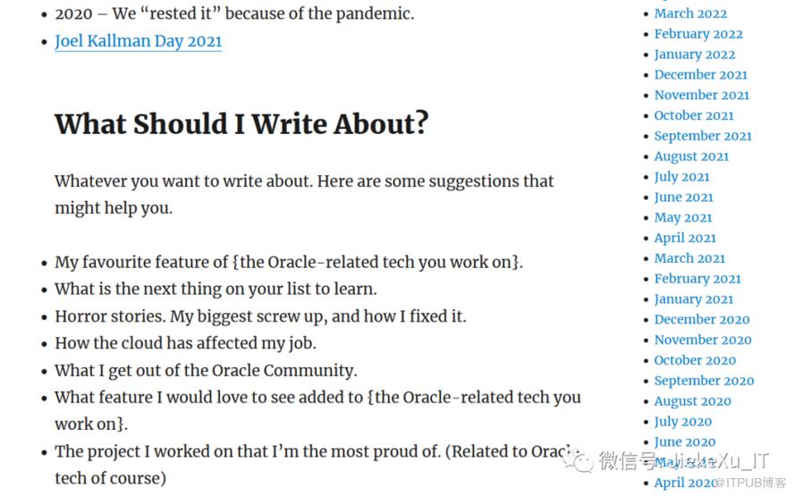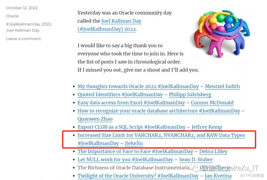 这无疑对社区的每个人都有很大的情感意义。所以,推荐我写的朋友也呼唤我也写点东西来支持这个活动。但是写什么呢?由于这是我第一次写,所以就写一个 Oracle 新特性吧。于是乎就用我蹩脚的英语加有道词典花了两个晚上写了人生中第一篇英文博客《Increased Size Limit for VARCHAR2, NVARCHAR2, and RAW Data Types#JoelKallmanDay》(https://xiaoqiangxu.wordpress.com/2022/10/11/increased-size-limit-for-varchar2-nvarchar2-and-raw-data-typesjoelkallmanday/)。并且第二日 Tim Hall 大师(https://oracle-base.com/misc/site-info#biog) 将来自全球的六、七十位社区伙伴的博客汇总到一起(https://oracle-base.com/blog/),如下,我的文章刚好被排在第六位。