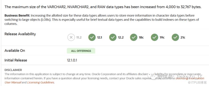 在 Oracle 新特性网站上(https://apex.oracle.com/database-features/),有一个关于扩展数据类型的新特性 “VARCHAR2、NVARCHAR2 和 RAW 数据类型的最大大小已从 4000 增加到 32,767 字节”。