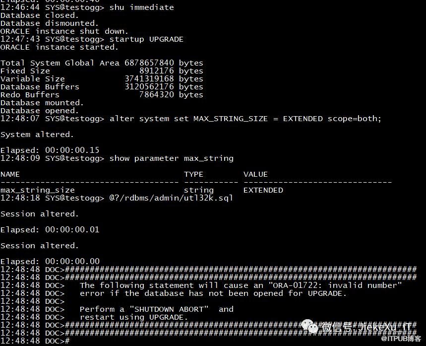 值得注意的是如果您的数据库是 RAC,需要关闭 node2 并修改集群参数 CLUSTER_DATABASE=FALSE。如果你的数据库还有 ADG 备库,请立即修改 MAX_STRING_SIZE 并重启,否则备库不修改此参数会导致 MRP0 进程异常宕掉,造成主备数据不同步的情况。