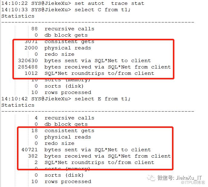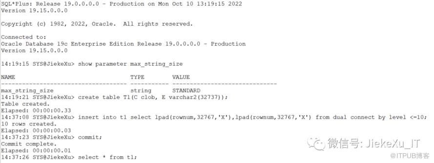 sqlplus / as sysdbaset timing on time on: Release 19.0.0.0.0 - Production on Mon Oct 10 13:43:15 2022Version 19.4.0.0.0Copyright (c) 1982, 2019, Oracle. All rights reserved.Connected to:Oracle Database 19c Enterprise Edition Release 19.0.0.0.0 - ProductionVersion 19.4.0.0.0show parameter max_string_sizeNAME TYPE VALUEmax_string_size string STANDARD14:02:42 SYS@JiekeXu> create table T1(C clob, E varchar2(32737));Table created.14:03:09 SYS@JiekeXu> insert into t1 select lpad(rownum,32767,'X'),lpad(rownum,32767,'X') from dual connect by level <=10;10 rows created.14:03:14 SYS@JiekeXu> commit;Commit complete.14:03:19 SYS@JiekeXu> set autot trace stat14:04:04 SYS@JiekeXu> select C from t1;