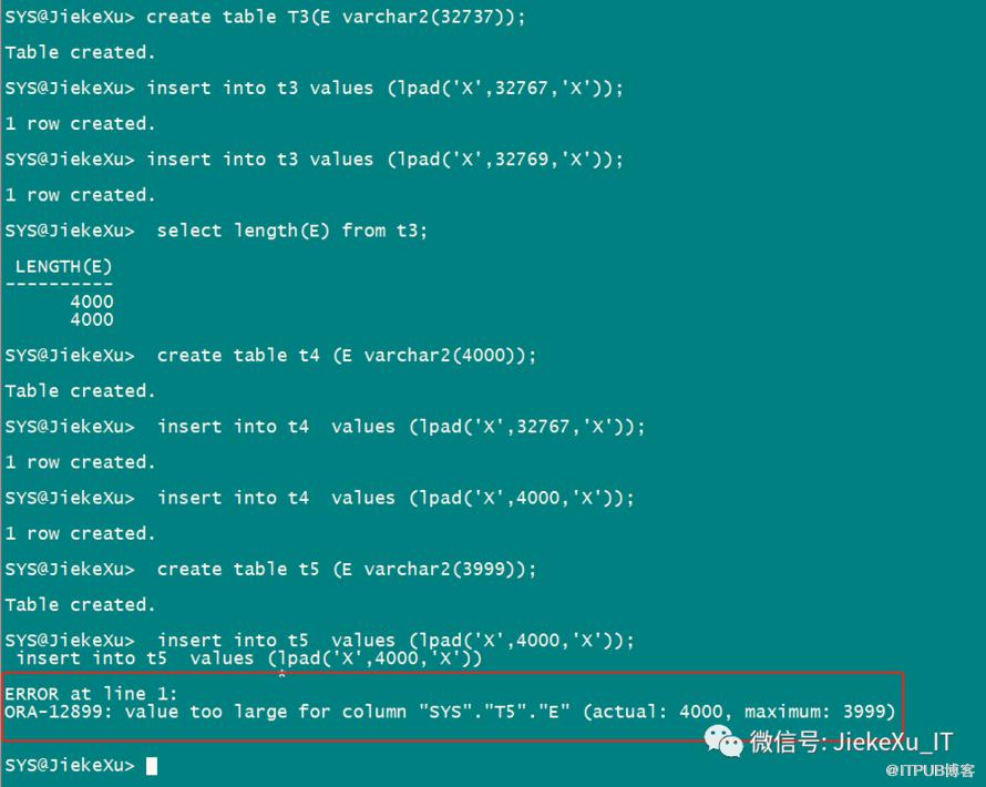 create table T1(id int, E varchar2(32767));CREATE SEQUENCE SEQ_T1 MINVALUE 1 MAXVALUE 99999999999999 INCREMENT BY 1 START WITH 1 CACHE 50 ORDER NOCYCLE;insert into t1 values(SEQ_T1.nextval,lpad('x',32767,'x'));insert into t1 values(SEQ_T1.nextval,lpad('x',32768,'x'));commit;select length(E) from t1;