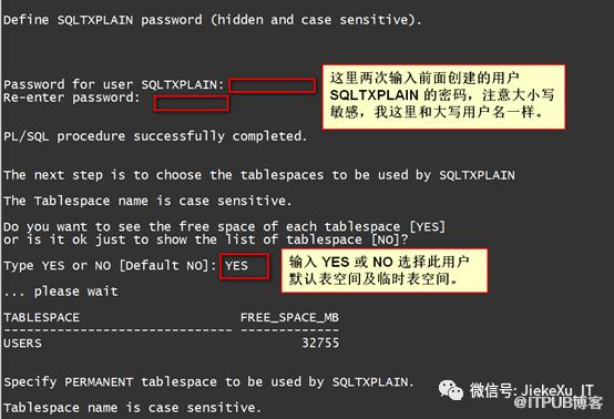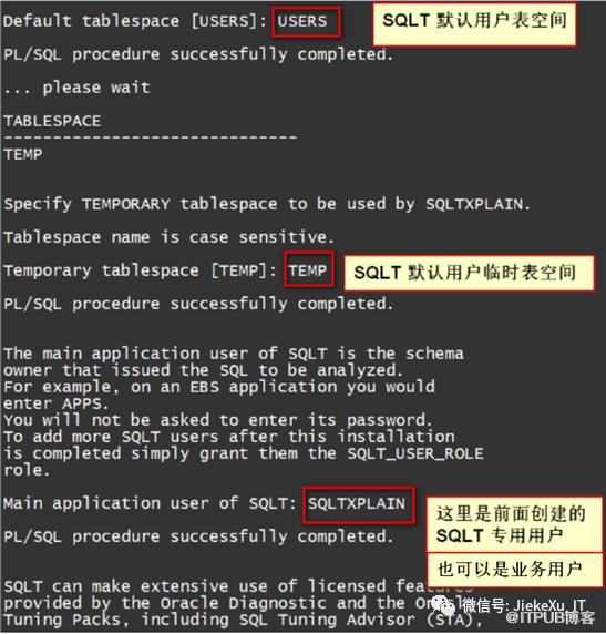 然后执行脚本 @sqcreate.sql 输入连接串,创建 SQLT 用户的密码以及默认表空间等信息。