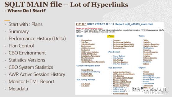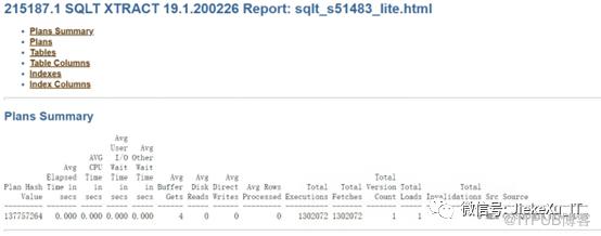 主要的执行方法一般是 sqltxtract.sql 加 sqlid, 输入 SQLT 密码,然后便会生成 sqlt+日期+sqlid 结尾的 zip 包,解压后内容很多,我们一般情况下只需要关注 sqlt*lite.html 和 sqlt*main.html 结尾的文件就好,sqltlite.html 算是轻量级的 SQLT,sqltmain.html 是详细的信息。XTRACT Method、XECUTE Method 等其他方法可参考 SQLT 的安装介绍文档:sqlt_instructions.html。