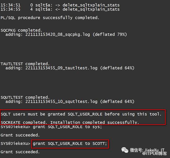 SYS@JiekeXu> alter session set container=JIEKEXUPDB1;SYS@JiekeXu> create user SQLTXPLAIN identified by SQLTXPLAIN; --当然也可以不用提前创建用户SYS@JiekeXu> grant CREATE SESSION,CREATE TABLE TO SQLTXPLAIN;SYS@JiekeXu> .sqladding: 221113152749_01_sqcreate.log (deflated 87%)Optional Connect Identifier (ie: ): <--- 输入 TNS 连接名Password for user SQLTXPLAIN: <--- 输入专用用户密码Re-enter password: <--- 再次输入专用用户密码Type YES or NO [Default NO]: YES <--- 输入专用用户表空间和临时表空间名,大写Default tablespace [USERS]: USERSTemporary tablespace [TEMP]: TEMPMain application user of SQLT: SQLTXPLAIN <--- 输入专用用户名,大写"T" if you have license for Diagnostic and Tuning"D" if you have license only for Oracle Diagnostic"N" if you do not have these two licensesOracle Pack license [T]: T <--- 输入 license TSQLT users must be granted SQLT_USER_ROLE before using this tool.SQCREATE completed. Installation completed successfully.SYS@JiekeXu> GRANT INHERIT PRIVILEGES ON USER SYS TO SQLTXADMIN;SYS@JiekeXu> grant SQLT_USER_ROLE to sys;SYS@JiekeXu> grant SQLT_USER_ROLE to SCOTT;