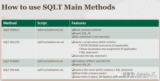 SQLT main methods 连接到数据库并收集执行计划、基于成本的优化器 CBO 统计信息、架构对象元数据、性能统计信息、配置参数以及影响正在分析的一个 SQL 的性能的其他元素。