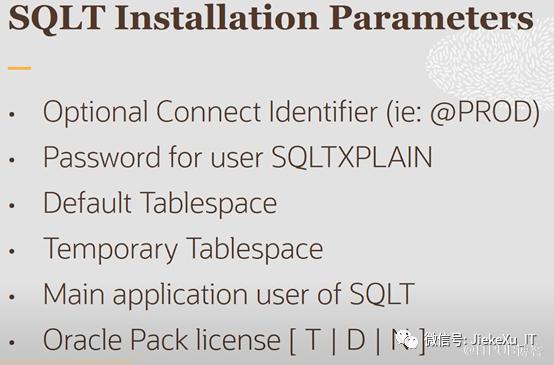 这里说一下 Oracle pack license 这里,SQLT 本身不需要 licence,输入 T 的话收集的结果会包含 sql tuning 结果,输入 D 的话会包含 awr 报告信息,输入 N 这里就不包含这两项信息。如果不想使用 SQLT 的话可以使用脚本 ./sqlt/install/sqdrop.sql 直接卸载。
