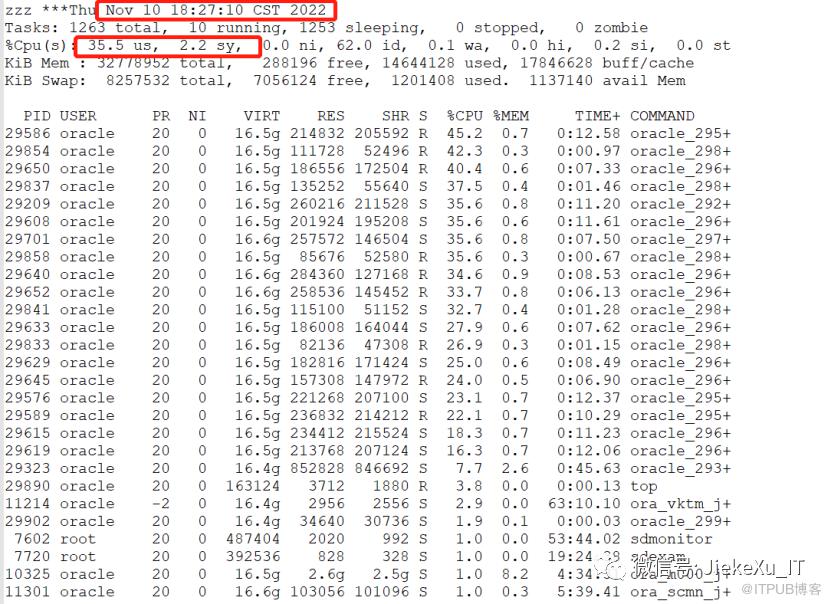 [root@oracle19c ~]# free -m              total        used        free      shared  buff/cache   availableMem:          64264       32915        9735        1399       21613       14964Swap:          8063          50        8013[root@oracle19c ~]# uptime 20:47:58 up 33 days,  8:14,  1 user,  load average: 3.93, 3.81, 3.90