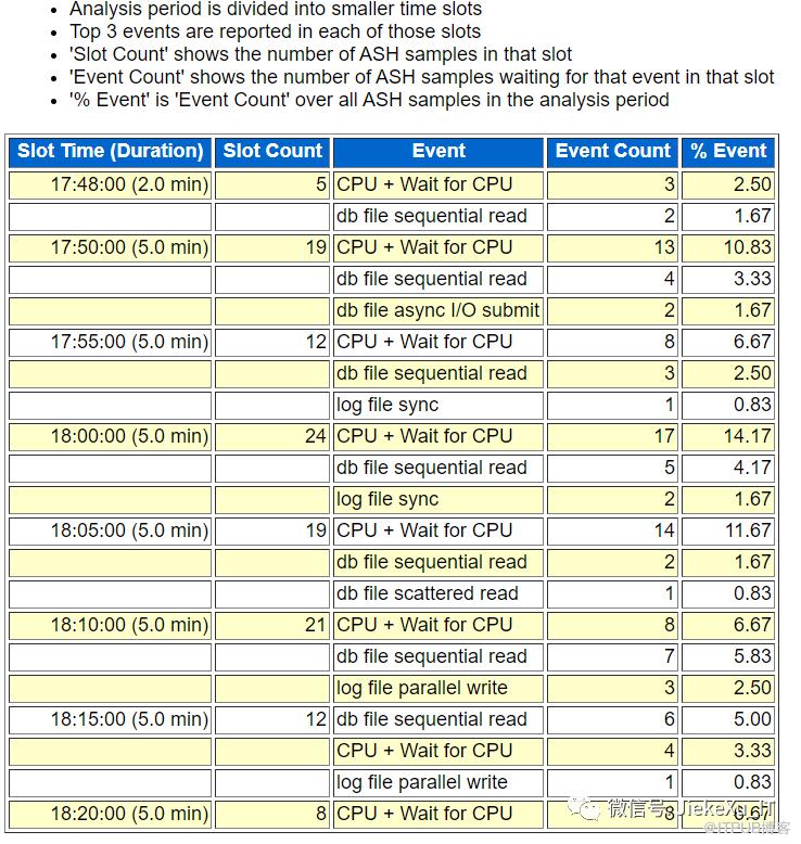 通过收集到的 ASH 信息,当时数据库基本上是忙于 CPU 的调度与等待,“CPU + Wait for CPU” 等待事件比较多,但想要查看进一步的信息就没有了。