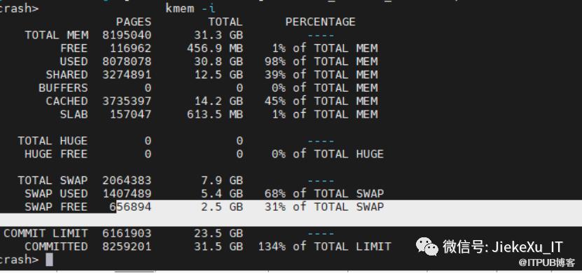系统工程师通过 crash 工具分析 core dump 可以看到宕机时的 os 内存使用已经达到了 98%,并且 swap 也已经使用了 68%。