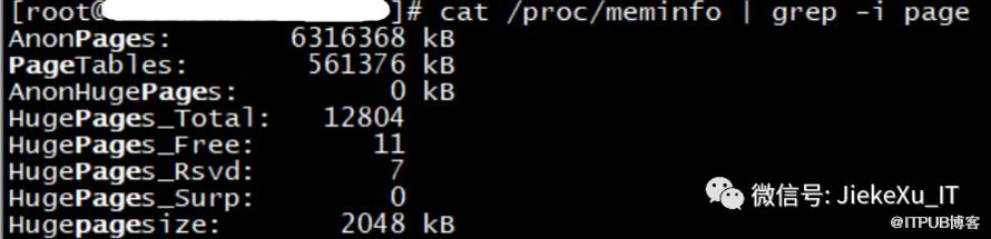 [root@oracle19c ~]# grep -i page /proc/meminfo AnonPages:       6405828 kBPageTables:       561288 kBAnonHugePages:         0 kBHugePages_Total:   12804HugePages_Free:       11HugePages_Rsvd:        7HugePages_Surp:        0Hugepagesize:       2048 kB