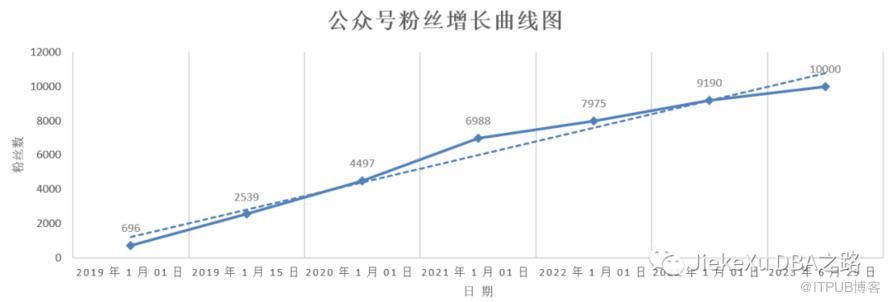 从 2018 年 5 月份开始写下第一篇文章,到今年六月份,算是五年的时间,每年每月都会写下几篇原创文章,截止到今日,共计 210 篇原创文章,累计发文 300 次,说明也还有 90 篇非原创文章,不过后台没有统计字数的功能,不知道一共写了多少字了,值得高兴的是在上月底,也就是 6 月 29 日我的个人微信公众号《JiekeXu DBA之路》关注粉丝数突破 10000,达到了一个小小的里程碑,算是实现了从 0 到 1 的小突破,也算是有点小激动,当然比起来哪些互联网大 V 来说这是微不足道的,不值一提。