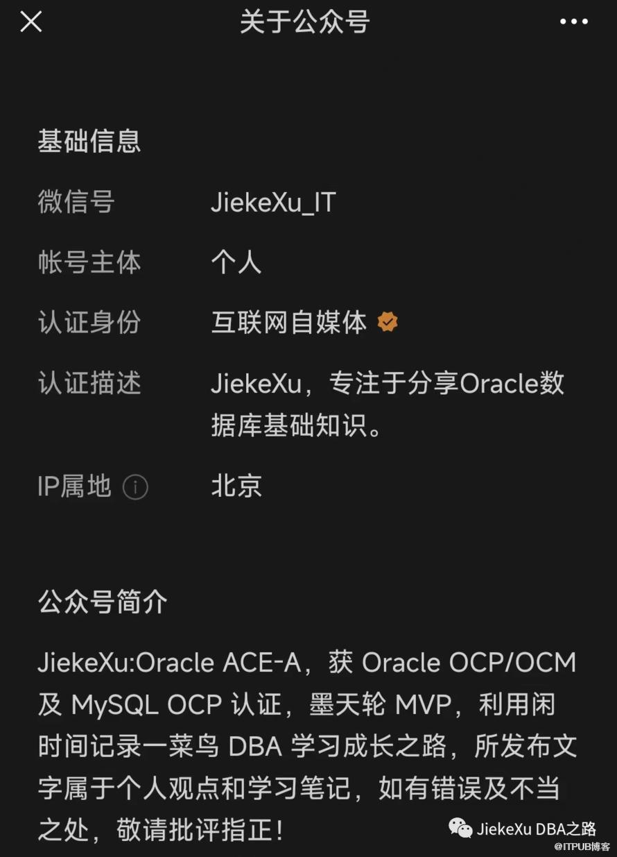 JiekeXu,一个北漂的大西北人,本科毕业于甘肃农业大学,传统行业 DBA,现混迹于数据江湖,一直从事于 Oracle 数据库管理运维工作,拥有金融行业上百 T 级数据量的数据库运维管理经验,现为 Oracle ACE-A,获得 Oracle OCP/OCM 及 MySQL OCP 认证,墨天轮 MVP,乐于交友,热爱分享。以下是我个人微信,欢迎各位漂亮的小姐姐和帅气的小哥哥来聊!