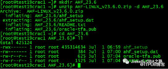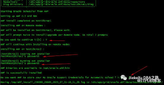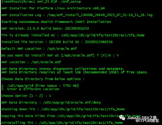 [root@test19crac1 AHF_23.6]# ./ahf_setupAHF Installer for Platform Linux Architecture x86_64AHF Installation Log : /tmp/ahf_install_236000_26649_2023_07_31-10_51_26.logStarting Autonomous Health Framework (AHF) InstallationAHF Version: 23.6.0 Build Date: 202306301433TFA is already installed at : /u01/app/19c/grid/tfa/test19crac1/tfa_homeInstalled TFA Version : 183300 Build ID : 20190315044534Default AHF Location : /opt/oracle.ahfDo you want to install AHF at [/opt/oracle.ahf] ? [Y]|N : YAHF Location : /opt/oracle.ahfAHF Data Directory stores diagnostic collections and metadata.AHF Data Directory requires at least 5GB (Recommended 10GB) of free space.Choose Data Directory from below options :1. /u01/app/grid [Free Space : 5701 MB]2. Enter a different LocationChoose Option [1 - 2] : 1AHF Data Directory : /u01/app/grid/oracle.ahf/dataShutting down TFA : /u01/app/19c/grid/tfa/test19crac1/tfa_homeCopying TFA Data Files from /u01/app/19c/grid/tfa/test19crac1/tfa_homeUninstalling TFA : /u01/app/19c/grid/tfa/test19crac1/tfa_homeDo you want to add AHF Notification Email IDs ? [Y]|N : NAHF will also be installed/upgraded on these Cluster Nodes :1. test19crac2The AHF Location and AHF Data Directory must exist on the above nodesAHF Location : /opt/oracle.ahfAHF Data Directory : /u01/app/grid/oracle.ahf/dataDo you want to install/upgrade AHF on Cluster Nodes ? [Y]|N : YExtracting AHF to /opt/oracle.ahfConfiguring TFA ServicesCopying TFA Data Files to AHFDiscovering Nodes and Oracle ResourcesStarting TFA ServicesCreated symlink from /etc/systemd/system/multi-user.target.wants/oracle-tfa.service to /etc/systemd/system/oracle-tfa.service.Created symlink from /etc/systemd/system/graphical.target.wants/oracle-tfa.service to /etc/systemd/system/oracle-tfa.service..--------------------------------------------------------------------------------.| Host | Status of TFA | PID | Port | Version | Build ID |+-------------+---------------+-------+------+------------+----------------------+| test19crac1 | RUNNING | 34212 | 5000 | 23.6.0.0.0 | 23600020230630143300 || test19crac2 | RUNNING | 10468 | 5000 | 18.3.3.0.0 | 18330020190315044534 |'-------------+---------------+-------+------+------------+----------------------'Running TFA Inventory...Adding default users to TFA Access list....------------------------------------------------------------------.| Summary of AHF Configuration |+-----------------+------------------------------------------------+| Parameter | Value |+-----------------+------------------------------------------------+| AHF Location | /opt/oracle.ahf || TFA Location | /opt/oracle.ahf/tfa || Orachk Location | /opt/oracle.ahf/orachk || Data Directory | /u01/app/grid/oracle.ahf/data || Repository | /u01/app/grid/oracle.ahf/data/repository || Diag Directory | /u01/app/grid/oracle.ahf/data/test19crac1/diag |'-----------------+------------------------------------------------'Starting Orachk Scheduler from AHFSetting up AHF CLI and SDKAHF install completed on test19crac1Installing AHF on Remote Nodes :AHF will be installed on test19crac2, Please wait.AHF will prompt twice to install/upgrade per Remote Node. So total 2 promptsDo you want to continue Y|[N] : YAHF will continue with Installing on remote nodesInstalling AHF on test19crac2 :[test19crac2] Copying AHF Installerroot@test19crac2's password:[test19crac2] Running AHF Installerroot@test19crac2's password:AHF binaries are available in /opt/oracle.ahf/binAHF is successfully installedDo you want AHF to store your My Oracle Support Credentials for Automatic Upload ? Y|[N] : NMoving /tmp/ahf_install_236000_26649_2023_07_31-10_51_26.log to /u01/app/grid/oracle.ahf/data/test19crac1/diag/ahf/[root@test19crac1 AHF_23.6]#