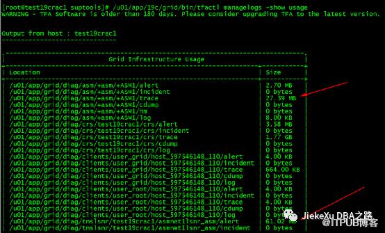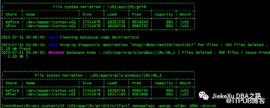 /u01/app/19c/grid/bin/tfactl managelogs -purge -older 30d -gi/u01/app/19c/grid/bin/tfactl managelogs -show usage -gi