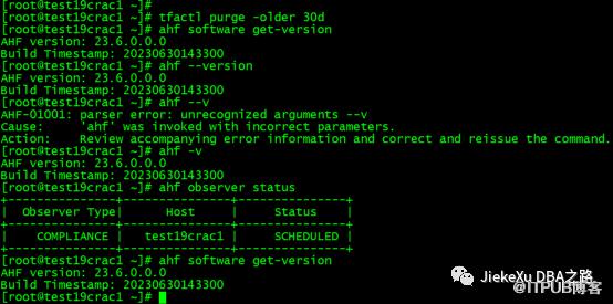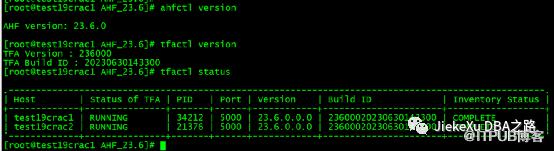 [root@test19crac1 AHF_23.6]# ahfctl version[root@test19crac1 AHF_23.6]# tfactl version[root@test19crac1 AHF_23.6]# tfactl status