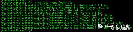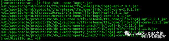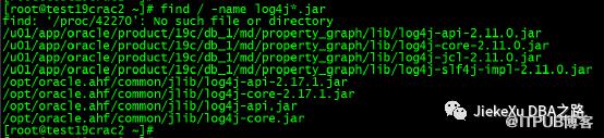 [root@test19crac1 ~]# find /u01 -name log4j*.jar/u01/app/19c/grid/suptools/tfa/release/tfa_home/jlib/log4j-api-2.9.1.jar/u01/app/19c/grid/suptools/tfa/release/tfa_home/jlib/log4j-core-2.9.1.jar/u01/app/19c/grid/tfa/test19crac1/tfa_home/jlib/log4j-api-2.9.1.jar/u01/app/19c/grid/tfa/test19crac1/tfa_home/jlib/log4j-core-2.9.1.jar/u01/app/oracle/product/19c/db_1/suptools/tfa/release/tfa_home/jlib/log4j-api-2.9.1.jar/u01/app/oracle/product/19c/db_1/suptools/tfa/release/tfa_home/jlib/log4j-core-2.9.1.jar/u01/app/oracle/product/19c/db_1/md/property_graph/lib/log4j-jcl-2.11.0.jar/u01/app/oracle/product/19c/db_1/md/property_graph/lib/log4j-slf4j-impl-2.11.0.jar/u01/app/oracle/product/19c/db_1/md/property_graph/lib/log4j-api-2.11.0.jar/u01/app/oracle/product/19c/db_1/md/property_graph/lib/log4j-core-2.11.0.jar