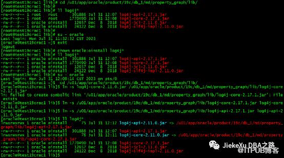 cp /u01/app/oracle/product/19c/db_1/md/property_graph/lib/log4j* /home/oraclerm -rf /u01/app/oracle/product/19c/db_1/md/property_graph/lib/log4j-api-2.11.0.jarrm -rf /u01/app/oracle/product/19c/db_1/md/property_graph/lib/log4j-core-2.11.0.jarcp /opt/oracle.ahf/common/jlib/log4j-api-2.17.1.jar /u01/app/oracle/product/19c/db_1/md/property_graph/lib/cp /opt/oracle.ahf/common/jlib/log4j-core-2.17.1.jar /u01/app/oracle/product/19c/db_1/md/property_graph/lib/chown oracle:oinstall /u01/app/oracle/product/19c/db_1/md/property_graph/lib/log4j*su - oracleln -s /u01/app/oracle/product/19c/db_1/md/property_graph/lib/log4j-core-2.17.1.jar log4j-core-2.11.0.jarln -s /u01/app/oracle/product/19c/db_1/md/property_graph/lib/log4j-api-2.17.1.jar log4j-api-2.11.0.jar#reboot