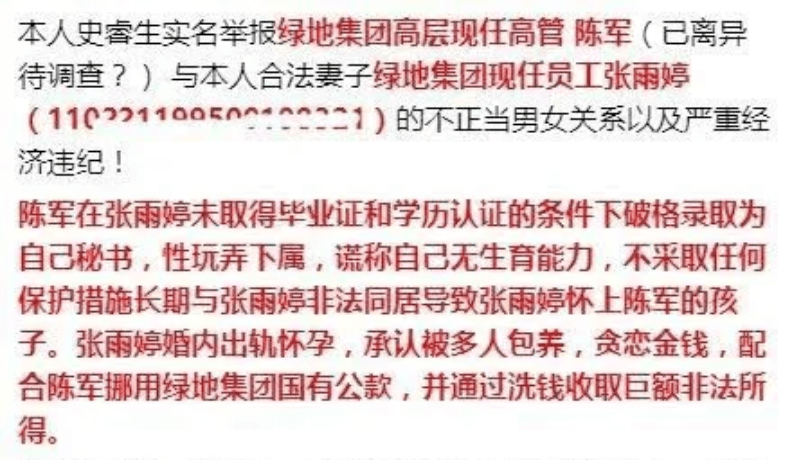 5月11日,一则史睿生实名举报 绿地高管陈军,与史睿生之妻、绿地员工张雨婷保持不正当男女关系,并 涉及挪用国有公款以及洗钱等严重违纪问题的消息,彻底引爆网络。