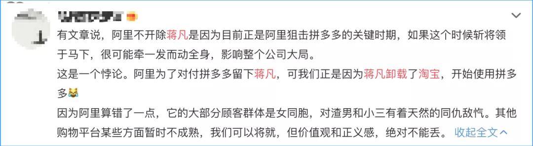 这一事件带来的影响,还在持续。《蒋凡事件之后,阿里还拿什么谈内部反腐?》一文指出,“这确实是阿里处理蒋凡的难点所在,按照自己一贯标榜的价值观来处理吧,与拼多多竞争的大局可能会遭遇重挫; 网开一面吧,又将“价值观”摆到何处呢?”