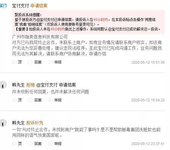 但是在另一类似投诉中,宝付支付给出的回应是“对方已与我司终止合作,未联系上商户。如有业务情况请联系商户核实,如该商户无法为您妥善处理,建议走司法程序。”