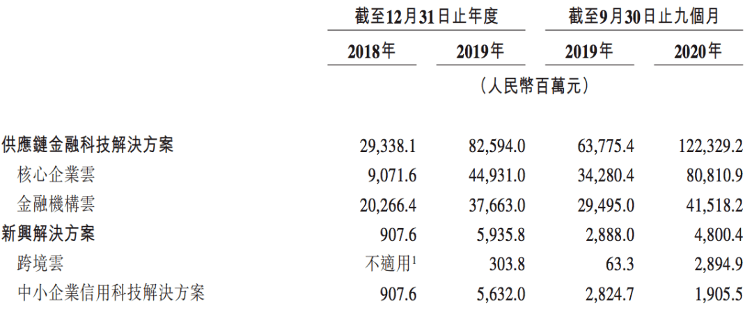新兴解决方案是指跨境云及中小企业信用科技解决方案。其中,中小企业信用科技解决方案即为“助贷”。数据显示,该分部在2018年、2019年与2020年前三季度促成的融资规模分别为9.08亿元、56.32亿元、19.05亿元。