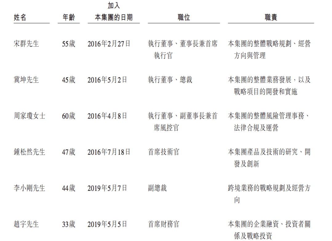 根据招股书,宋群为联易融董事长兼CEO、控股股东,其联合创始人冀坤为总裁,联合创始人周家琼为副董事长兼首席风控官。同时,其高管还包括首席技术官钟松然、副总裁李小刚、首席财务官赵宇等。