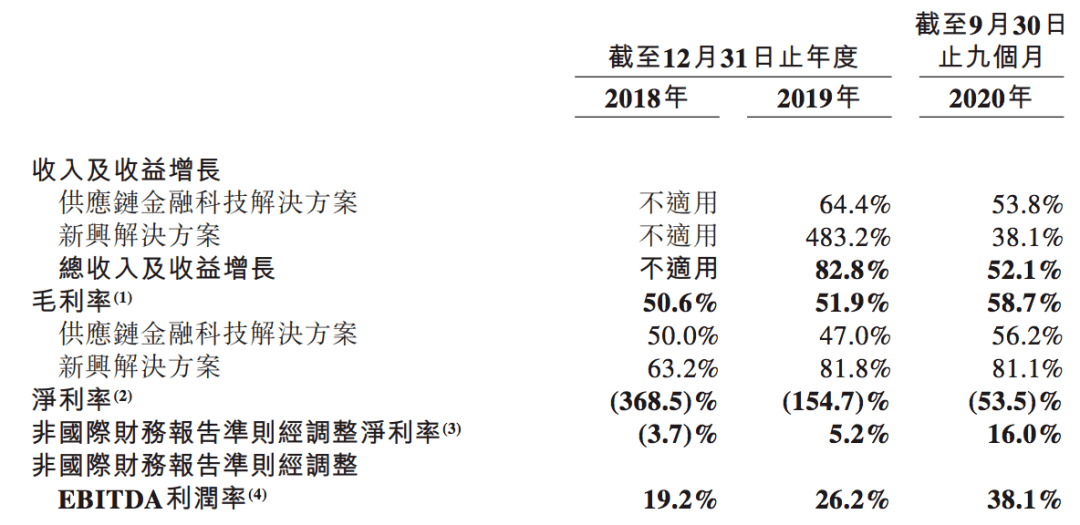 招股书显示,2018年、2019年,联易融经调整后的净利润分别为-1412.5万元、3650.5万元、1.30亿元。2020年前三个季度,联易融经调整后的净利润为1.3亿元,2019年同期为3700万元。