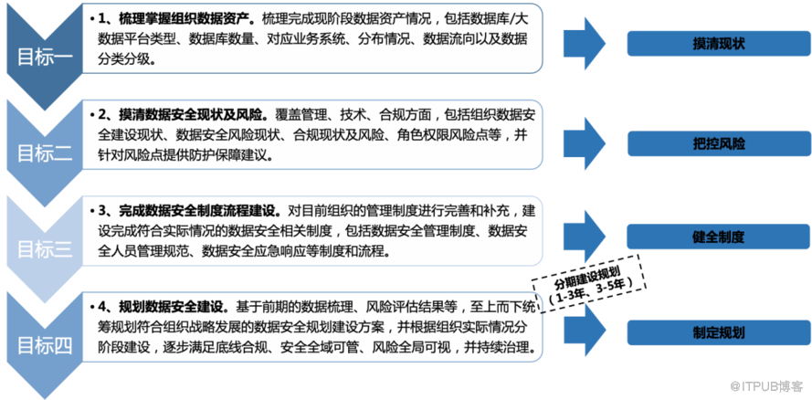 数据安全可信阶段:通过制度、人员、工具、流程等逐步达到数据全域可管和风险全局可视的中长期目标,最终以建立可信的数据源、可信的数据传输环境和存储环境,达到数据安全可信阶段,释放数据价值。