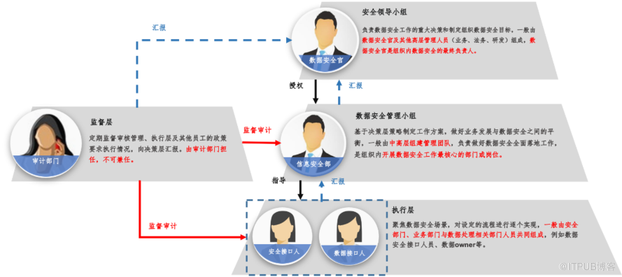 对数据处理活动进行风险评估, 进而 结合组织现状、数据分类分级结果、进行符合企业实际业务场景的 组织制度建设, 决策层、管理层、监督层、执行层的安全职责及动态协同机制 。