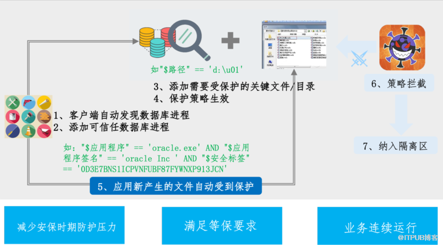 2 )数据库防勒索: 针对 各类 主流数据库、国产数据库, 诺亚防勒索内置数据库文件保护引擎, 指定数据库类型或添加数据库可执行程序, 允许可信任执行程序对受保护的数据库文件执行相关操作。