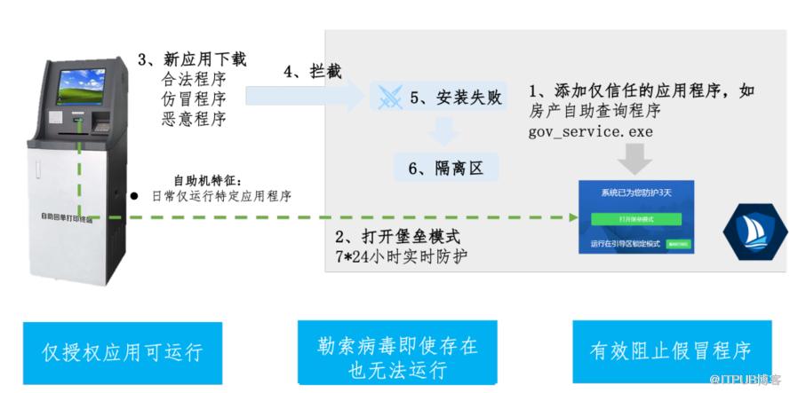 针对广泛使用哑终端的关键性行业,如银行ATM机、加油站自助机、医院自助查询机等 ,诺亚防勒索提供 堡垒模式, 确保只有 可信任的软件 可以 运行,其他任何新的软件都无法运行,任何新的软件都无法运行,勒索软件运行失败,从而无法破坏文件。