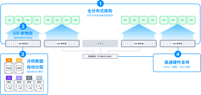 2.核心是分布式存储,每个服务器就是一个存储控制器,需要说明的是,其中每个节点都需要配置SSD盘作为缓存,缓存容量远大于传统存储的易失性内存,且多节点并发带来更强的聚合性能;
