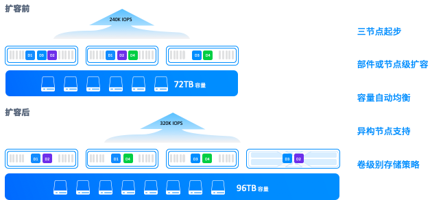 如前所述,超融合架构的核心分布式存储相对于传统存储在可扩展性上有了本质的提升,包括如下特点: