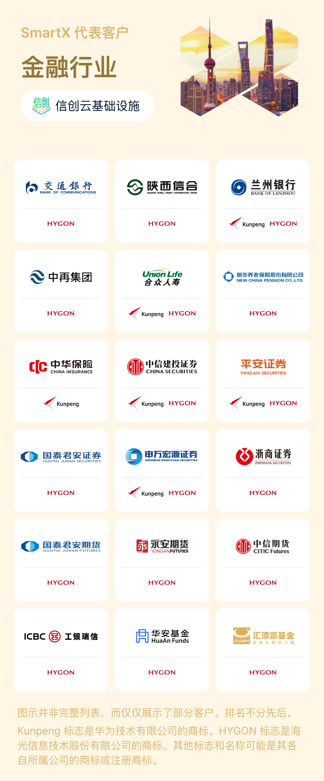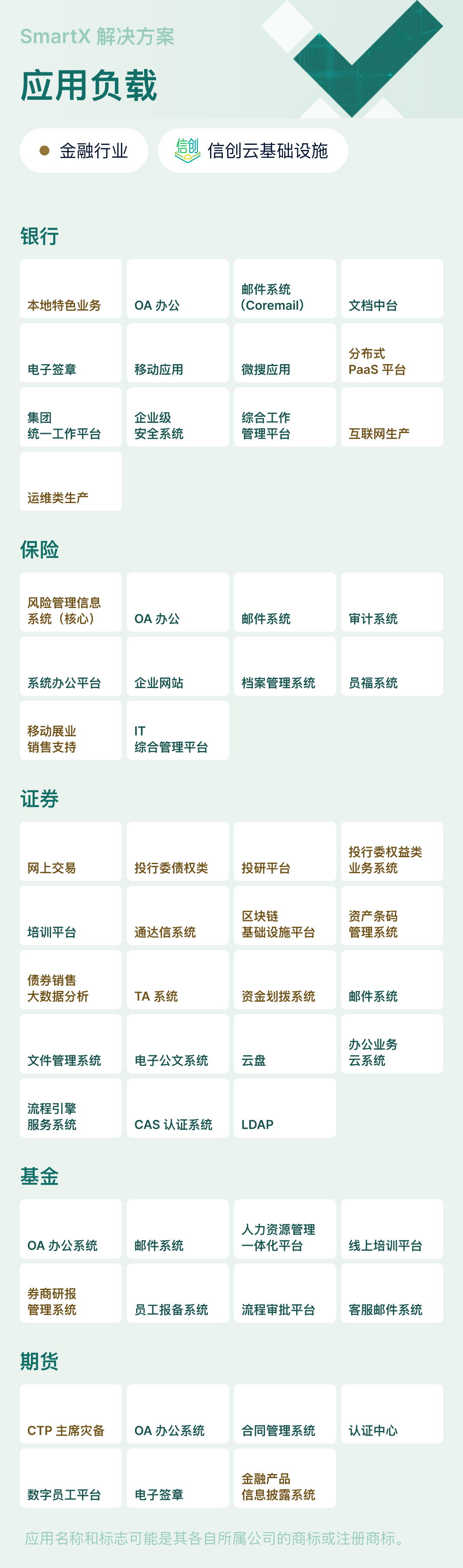 凭借在超融合、分布式存储等企业云基础设施产品的专业性与可靠性,以及对主流国产厂商的支持能力,SmartX 已得到金融机构的广泛认可。截至 2022 年第四季度, SmartX 超融合信创云基础设施已成为 40+ 金融机构的选择,并已成功落地 700+ 信创节点,覆盖生产(含办公)、灾备、开发测试等多种场景 。