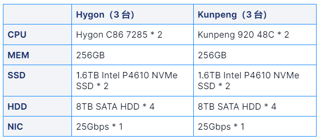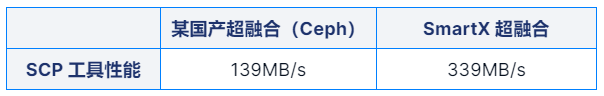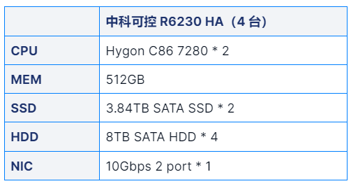 信创服务器共计 4 台,配置相同,某国产超融合(Ceph)与 SmartX 超融合使用同一套测试机分别进行测试。