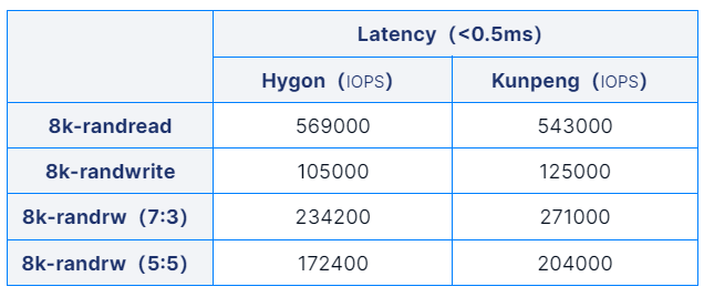 综上所述, 本次探索将存储延时限制在 0.5ms 范围内,来验证配置不同国产芯片(海光和鲲鹏)的 SmartX 超融合对数据库场景的支撑能力。本次测试设置 block size 为 8k(常见数据库),分别测试 100% 随机读、100% 随机写、7:3 混合读写、5:5 混合读写场景下 SmartX 超融合的性能表现。