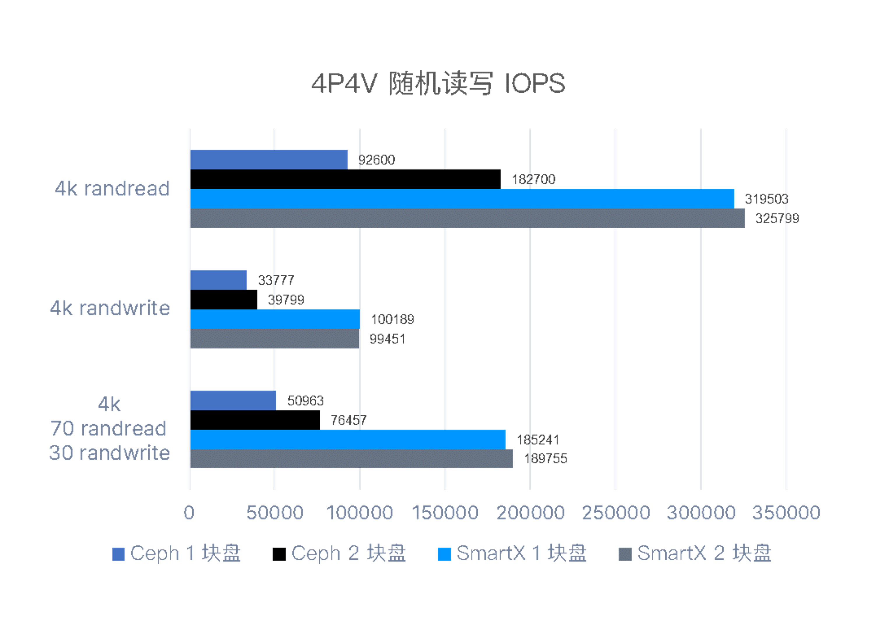 说明:“1 块盘”、“2 块盘”分别对应 1 个 VM 挂载的测试盘数量;P 代表超融合节点,V 代表压测的虚拟机。