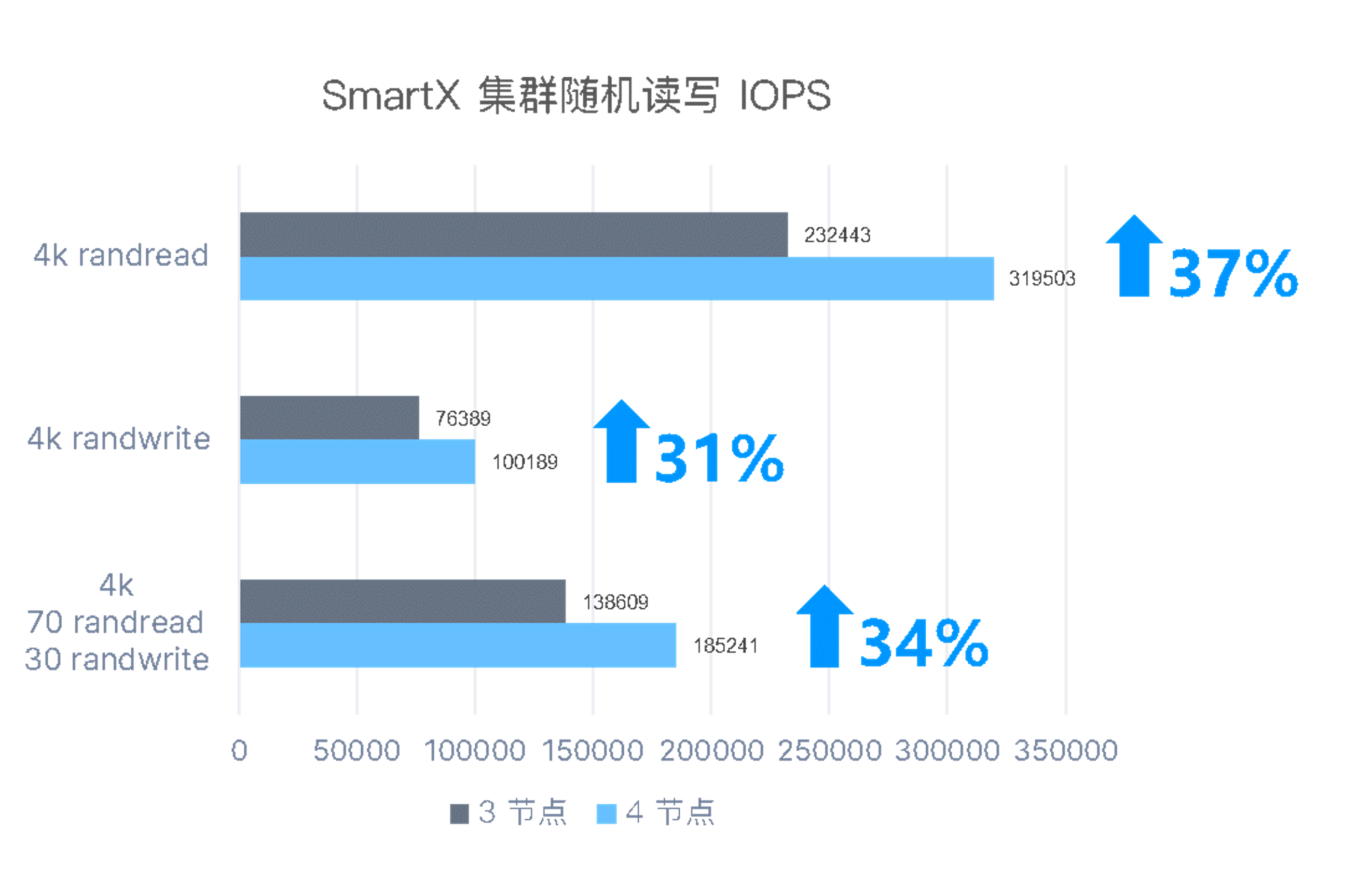 该场景测试 3 节点集群扩容 1 节点后,性能能否做到近似线性增长,3 扩 1 后如满足性能线性增长要求,性能提升比例为 33.3% 左右。