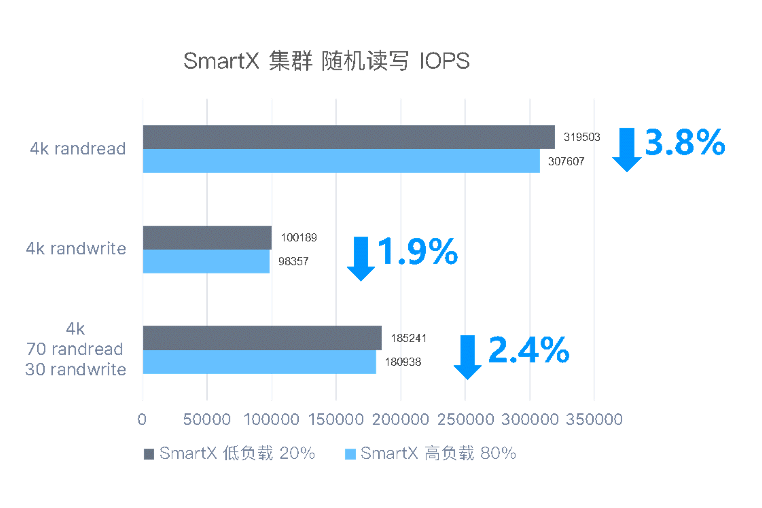 经充分探索和性能评估, 搭配国产芯片的 SmartX 超融合存储性能不仅能满足数据库场景的要求(指定延迟在 0.5ms 内),同时其在指定延迟下表现出的 IOPS 可充分应对绝大多数业务场景对性能的要求。