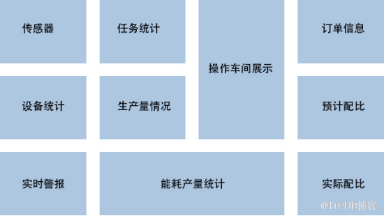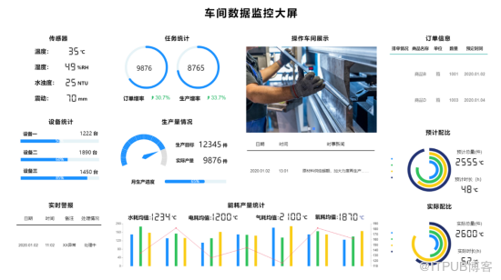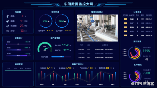 如上图所示是一张可视化大屏效果图,也是今天要教大家实操的内容。我们设计大屏首先要遵循四个基本操作:1)布局排版 2)色彩搭配 3)大屏装饰 4)动画效果