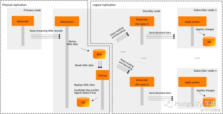 备库支持逻辑解码也是一项较大的提升,以减轻主库的压力。要求主库和备库都设置为 logical,当然这就会涉及到类似流复制冲突了,我们可以查看 pg_replication_slots.conflicting 字段,比如需要的字段在主库上被删了,或者主库将 wal_level 设为了小于 logical 的等级,这个时候备库的复制槽会变成 invalide 的状态。