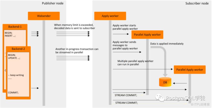 逻辑解码也有很多亮眼特性。首先是并行回放,对于"流式"事务 (流式 decoding 和发送,无需等待事务结束) ,订阅端无需等待发布端事务提交,并且可以创建多个 apply worker 并行回放 (每个事务一个 apply worker),进一步提升事务的处理能力,据测试显式,大约有 25% ~ 40% 的性能提升,不过具体效果会怎么样,还需要经过时间的验证,早期版本的并行也会有各种各样的 BUG,举个栗子,当 leader apply worker 和 apply worker 回放过程中遇到死锁冲突能否妥善处理。