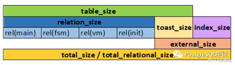 另外,就是我们日常使用的获取表大小的函数有很多种,比如 pg_relation_size、pg_table_size