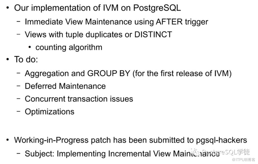 让我们看下第二个问题:手动刷新物化视图,物化视图不包含死元祖,但是生产中却包含死元组。首先,截止最新版本,原生 PostgreSQL 还不支持物化视图的增量刷新,当然可以通过 pg_ivm 插件来实现,但是限制颇多,比如分区表