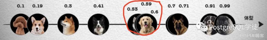 上面这张照片如果按照体型排序,可以看到体型越大的狗越靠近坐标轴右边,这样就能得到一个体型特征的一维坐标和对应的数值,从 0 到 1 的数字中得到每只狗在坐标系中的位置。