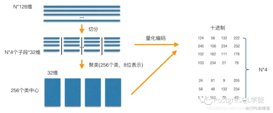 乘积量化——Product Quantization (PQ),意思是指把原来的向量空间分解为若干个低维向量空间的笛卡尔积,并对分解得到的低维向量空间分别做量化(quantization)。这样每个向量就能由多个低维空间的量化code组合表示。PQ 先将 D 维空间切分成 M 份,现在考虑一个 D=128 维的原始向量,它被切分成了 M=8 个 D=16 维的短向量。